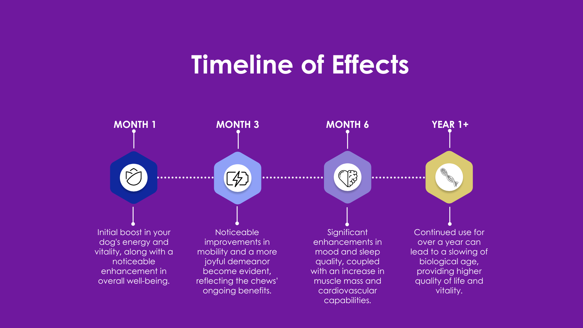 Results from our Longevity & Vitality chews can typically be observed within the first month of consistent daily use, though this may vary depending on the individual dog. The effects of NMN are gradual and cumulative, requiring ongoing use to achieve the full range of benefits. For optimal results, we recommend administering the chews to your dog for a minimum of one year.